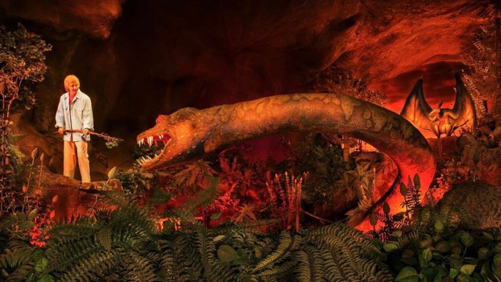 In the original version of the Universe of Energy, the Elasmosaurus, strategically positioned to appear as though it was moving directly towards the riders, created a thrilling experience. This placement enhanced the feeling of being immersed in the prehistoric world, where these massive creatures ruled.